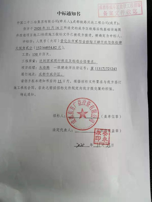 2020年11月23日,中國(guó)二十二冶集團(tuán)有限公司成都分公司中標(biāo)成華區(qū)鐵路沿線基礎(chǔ)設(shè)施提升改造項(xiàng)目。
