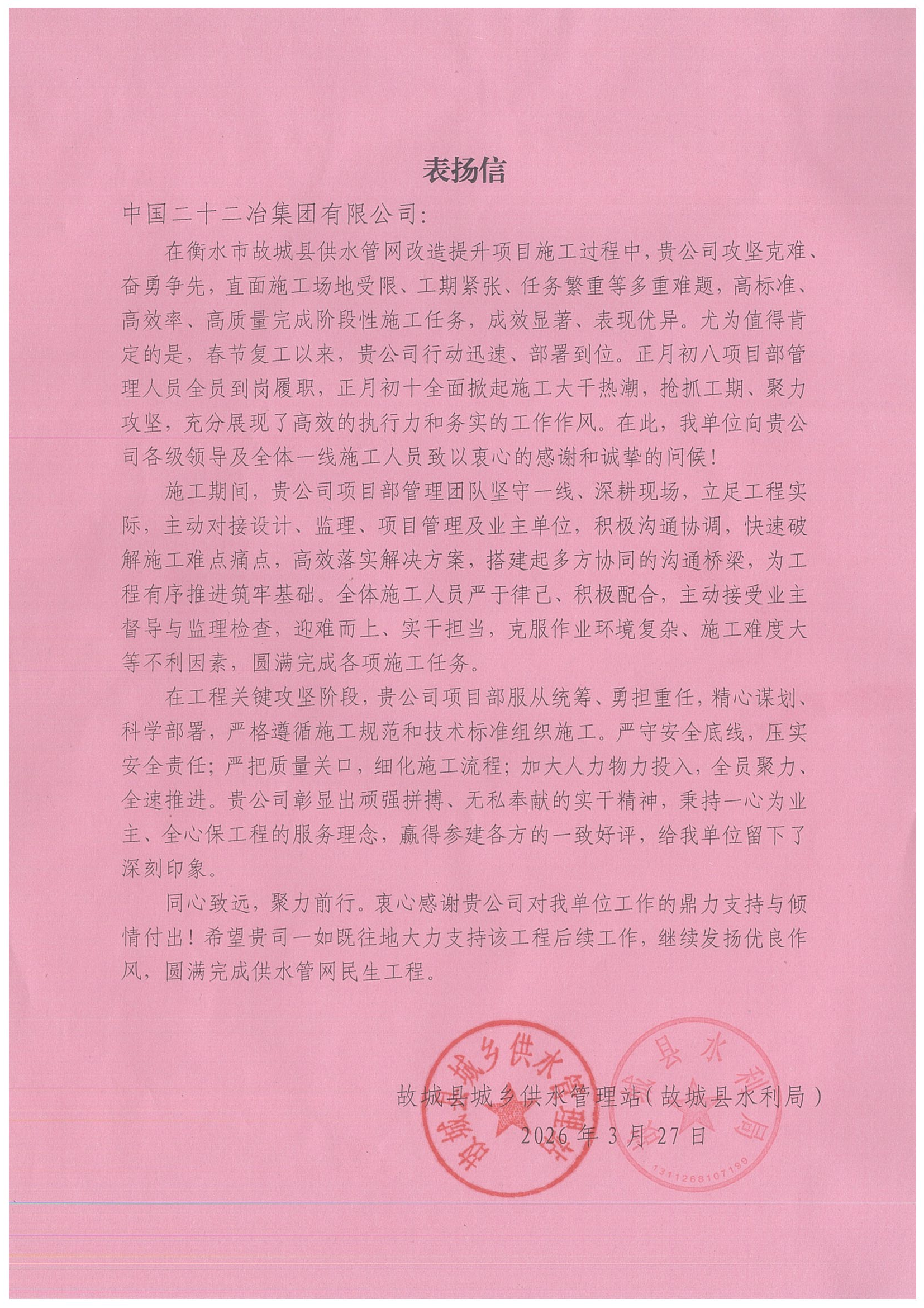 近日,華北公司衡水供水管網(wǎng)項(xiàng)目收到業(yè)主故城縣供水管理站、故城縣水利局表揚(yáng)信。
