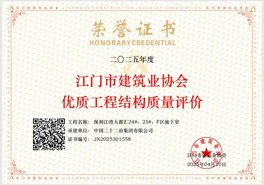 近日,廣東公司承建的江門保利江灣大都匯項(xiàng)目榮獲江門市建筑業(yè)協(xié)會(huì)優(yōu)質(zhì)工程結(jié)構(gòu)質(zhì)量評(píng)價(jià)。