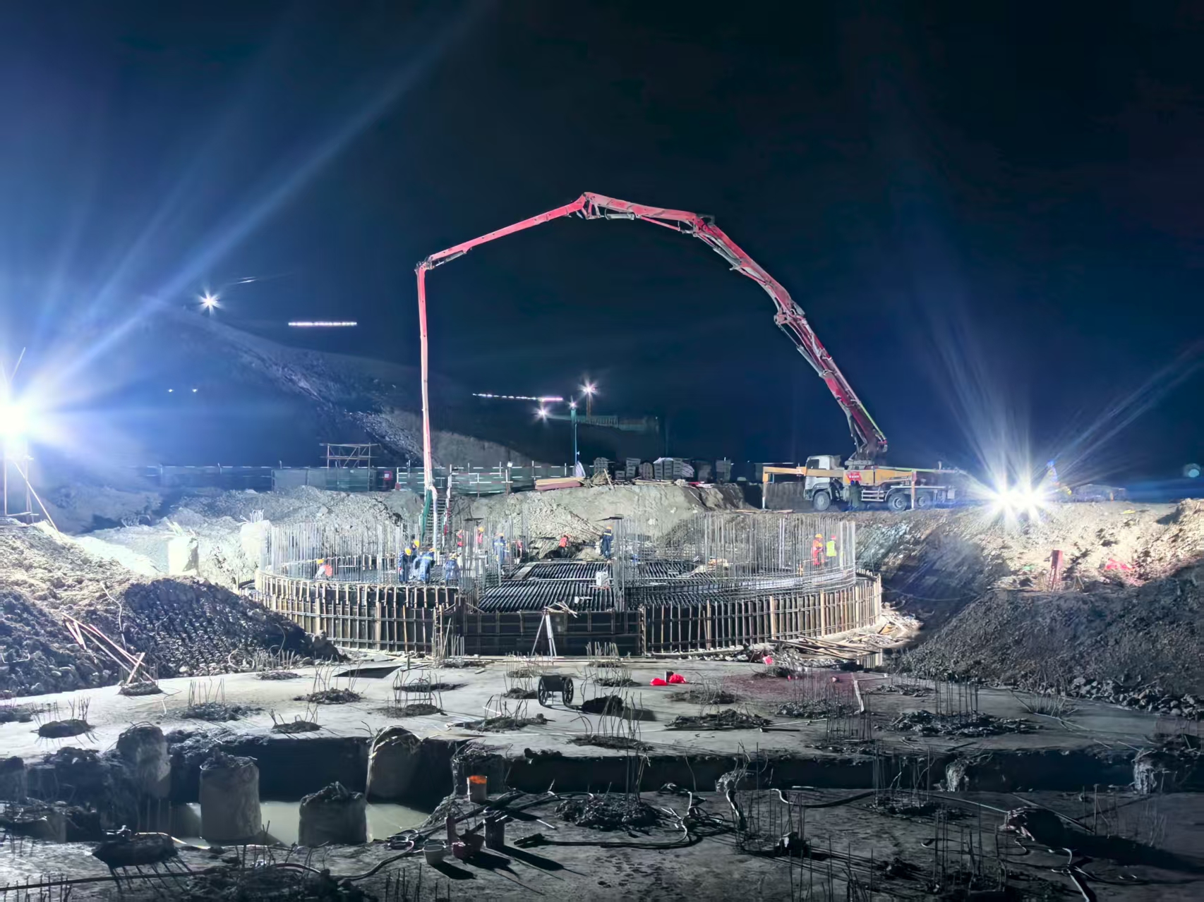施工過程中,面對場地狹窄、組織復(fù)雜、夜間連續(xù)作業(yè)等諸多挑戰(zhàn),項目團隊周密策劃、高效協(xié)調(diào),嚴格實施全過程質(zhì)量控制。從混凝土配比優(yōu)化到澆筑順序設(shè)計,從設(shè)備人員調(diào)配至實時施工監(jiān)測,每一環(huán)節(jié)均做到精準管控,歷時13小時,一次性順利完成650立方米混凝土澆筑,成為工程推進過程中的重要里程碑節(jié)點,為完成工程下一步施工奠定了堅實基礎(chǔ)。