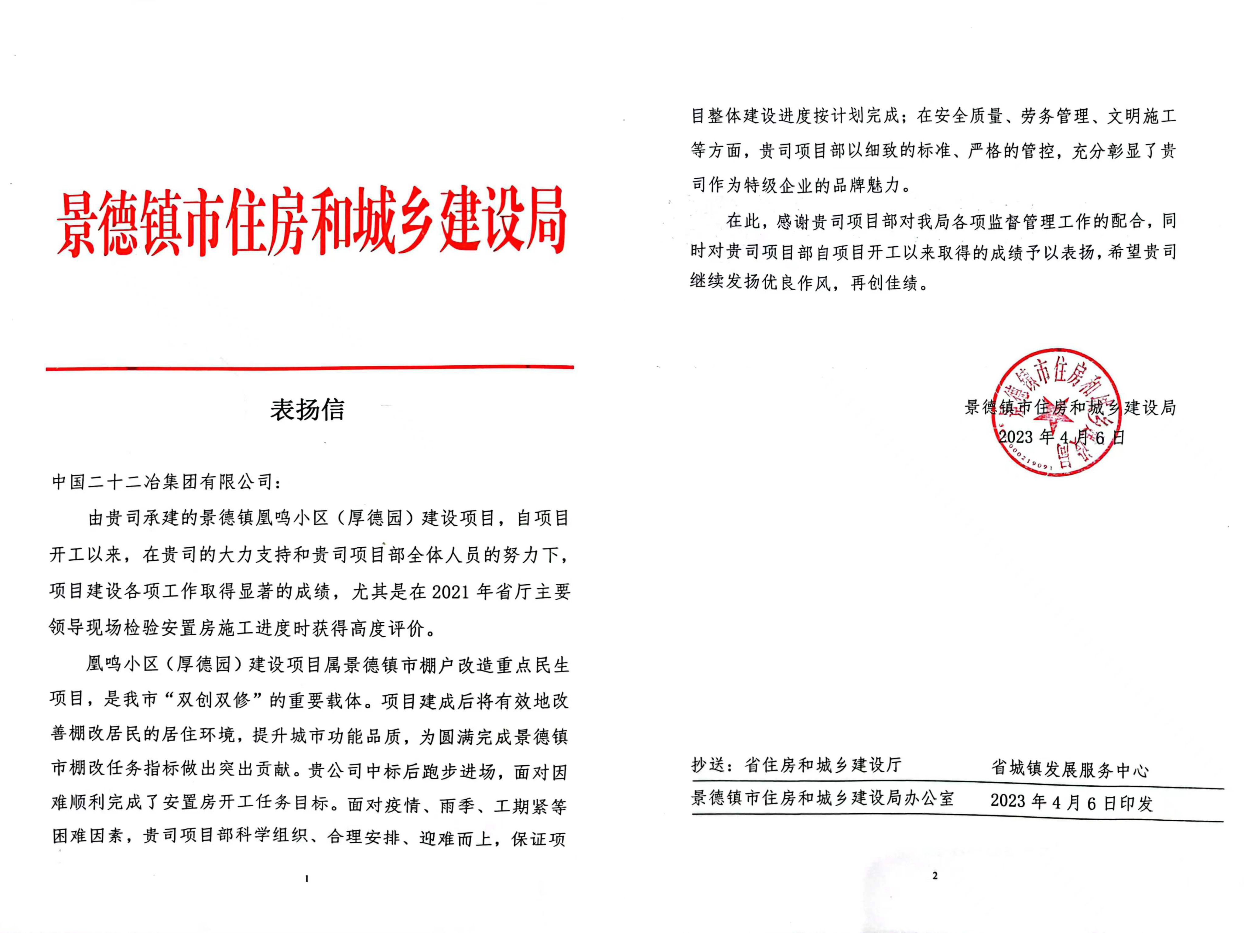 信中住房和城鄉(xiāng)建設局對凰鳴小區(qū)項目建設取得的成績以及對監(jiān)督管理工作的配合表示贊揚與肯定。希望項目部繼續(xù)發(fā)揮優(yōu)良作風,再創(chuàng)佳績,為圓滿完成景德鎮(zhèn)市棚改任務指標做出突出貢獻。