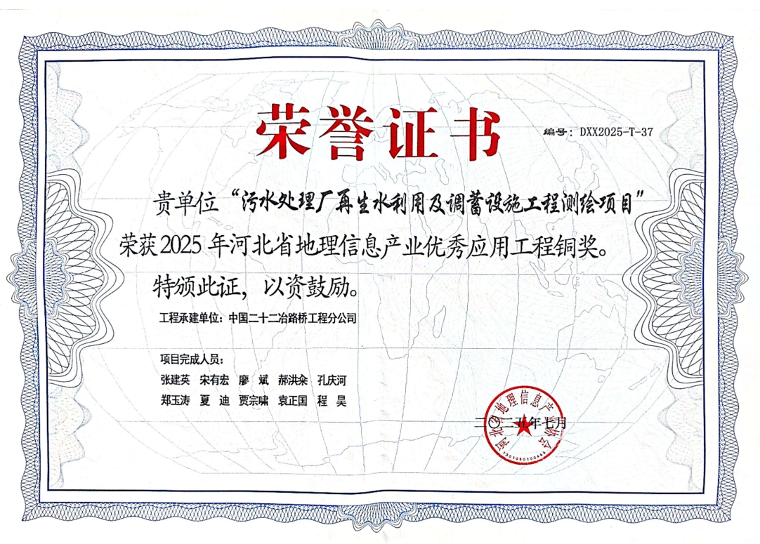 近日獲悉,在河北省地理信息產(chǎn)業(yè)協(xié)會主辦的權(quán)威評選中,路橋公司憑借“污水處理廠再生水利用及調(diào)蓄設施工程測繪項目”的卓越實踐,榮獲“2025年河北省地理信息產(chǎn)業(yè)優(yōu)秀應用工程銅獎”。