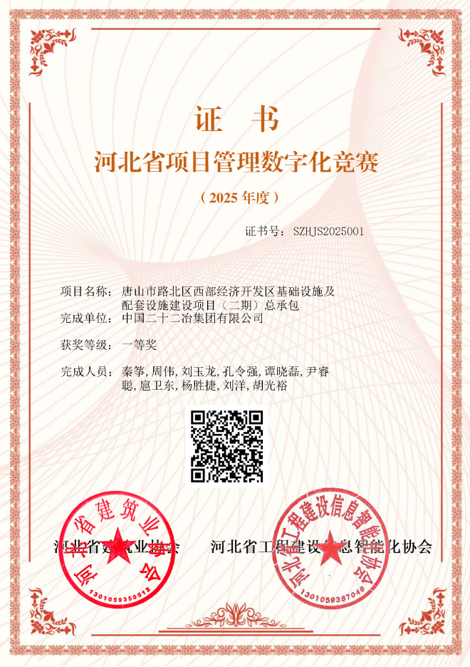 近日獲悉,路橋公司數字化團隊攜手路北市政二期項目,以全省第一名的成績獲河北省項目管理數字化競賽一等獎。