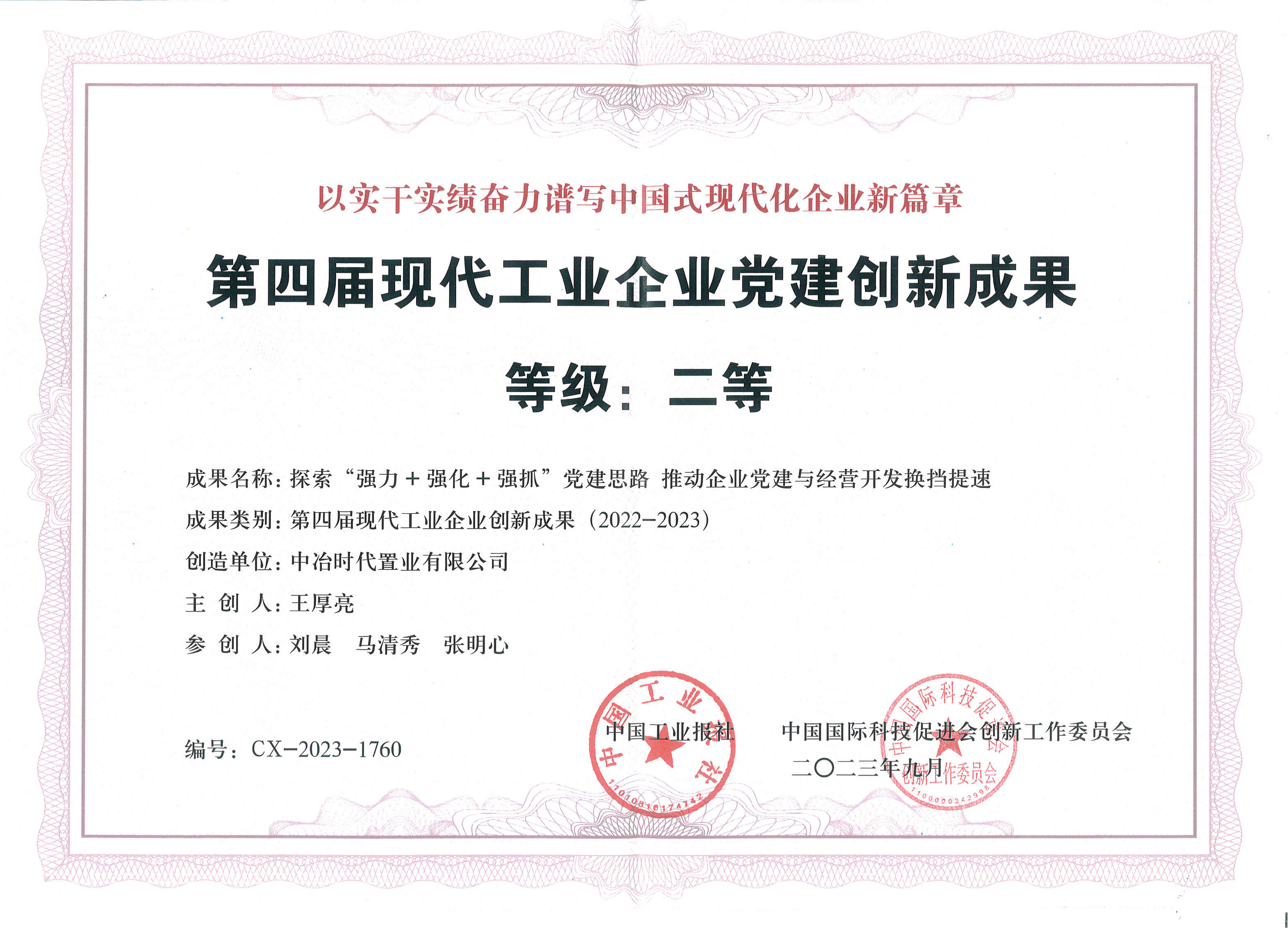 10月21日,在2023中國工業(yè)企業(yè)創(chuàng)新大會暨第四屆現(xiàn)代工業(yè)創(chuàng)新成果發(fā)布儀式上,時代置業(yè)公司申報的《探索“強(qiáng)力+強(qiáng)化+強(qiáng)抓”黨建思路 推動企業(yè)黨建與經(jīng)營開發(fā)換擋提速》獲黨建創(chuàng)新成果二等獎,并被收錄至全國創(chuàng)新案例。