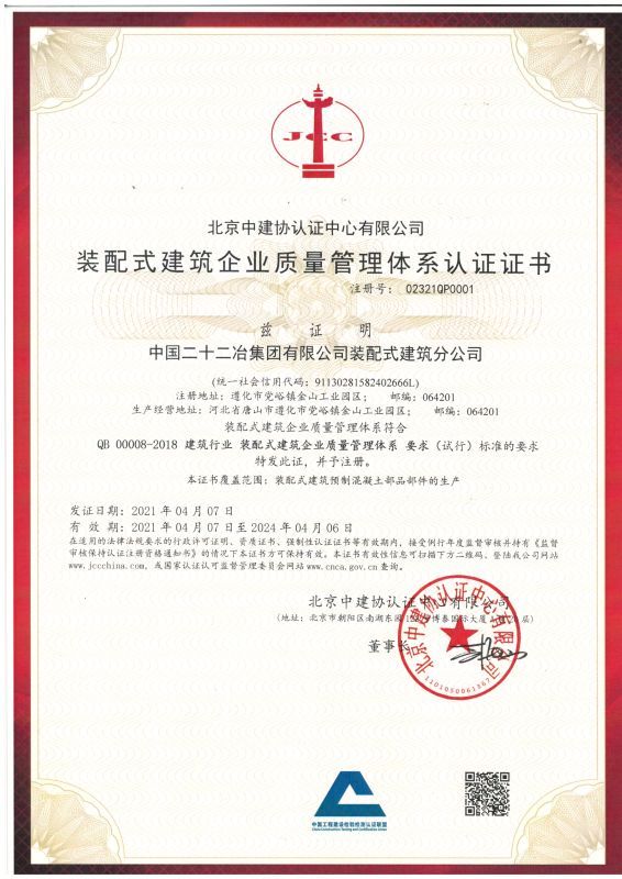 4月21日,裝配式建筑分公司收到由北京中建協(xié)認(rèn)證中心有限公司頒發(fā)的《裝配式建筑企業(yè)質(zhì)量管理體系認(rèn)證》證書(shū),證書(shū)注冊(cè)號(hào)為02321QP0001。此次證書(shū)的獲得,標(biāo)志著公司裝配式建筑質(zhì)量管理體系能力得到了充分認(rèn)可,對(duì)公司搶占市場(chǎng)先機(jī)、提升行業(yè)話語(yǔ)權(quán)、擴(kuò)大裝配式市場(chǎng)占有率、提升企業(yè)品牌知名度、提升公司綜合管理效率具有重要意義。