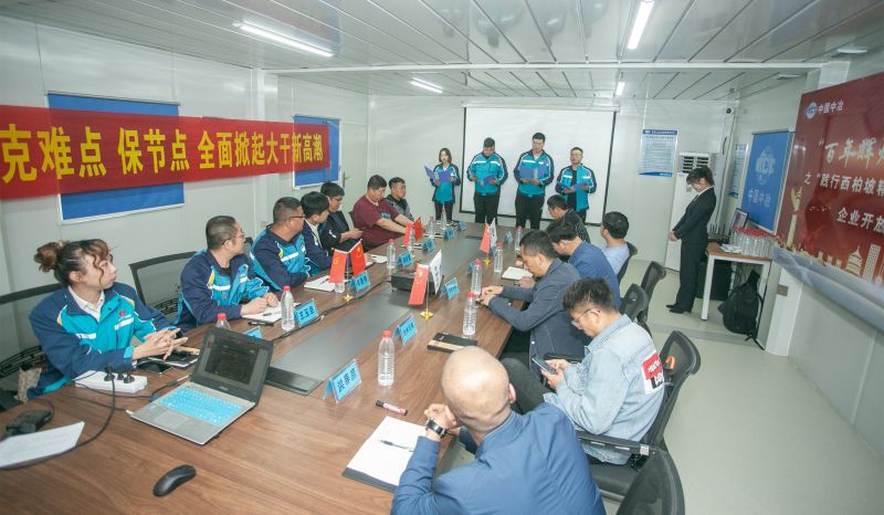 在“學(xué)黨史”環(huán)節(jié),通過“身臨其境學(xué)黨課”的方式講述了“選址西柏坡,新中國(guó)從這里走來(lái)”,緬懷革命先輩,不忘革命初心;項(xiàng)目青年團(tuán)朗誦詩(shī)歌《西柏坡精神頌》,展現(xiàn)項(xiàng)目青年員工積極向上、向黨靠攏的精神風(fēng)貌。在“悟思想”環(huán)節(jié),項(xiàng)目管理人員上臺(tái)宣誓,承諾在工作、生活中積極踐行“西柏坡精神”,建設(shè)人民滿意工程,造福滄州百姓;業(yè)主及項(xiàng)目管理人員在“抓重點(diǎn)、克難點(diǎn)、保節(jié)點(diǎn),全面掀起大干新高潮”條幅上簽字承諾。在“辦實(shí)事”環(huán)節(jié),項(xiàng)目經(jīng)理向青年突擊隊(duì)授旗,提高項(xiàng)目青年員工責(zé)任擔(dān)當(dāng)意識(shí),為項(xiàng)目各項(xiàng)工作開展提供強(qiáng)勁動(dòng)力;項(xiàng)目黨員干部、青年突擊隊(duì)隊(duì)員與協(xié)力隊(duì)伍人員及當(dāng)?shù)鼐用窠Y(jié)對(duì)幫扶,并發(fā)放志愿服務(wù)卡,全力以赴幫助他們解決生活、工作中遇到的問題。在“開新局”環(huán)節(jié),項(xiàng)目工程經(jīng)理帶領(lǐng)與會(huì)人員參觀施工現(xiàn)場(chǎng),介紹項(xiàng)目的工程概況、工程重難點(diǎn),以及建設(shè)過程中的感人故事,讓與會(huì)人員感受企業(yè)的綜合實(shí)力以及建設(shè)人民滿意工程的決心和信心。