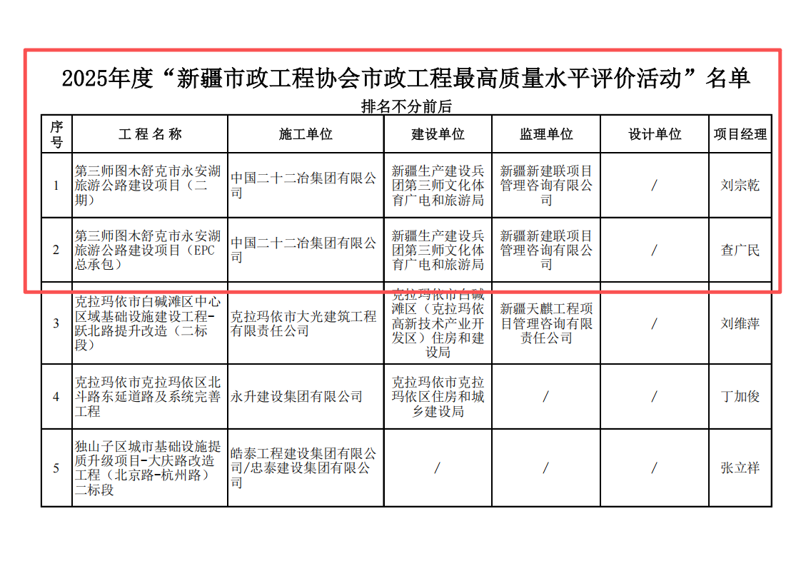 新疆公司永安湖旅游公路建設(shè)項目兩項工程榮獲新疆市政工程最高質(zhì)量水平評價